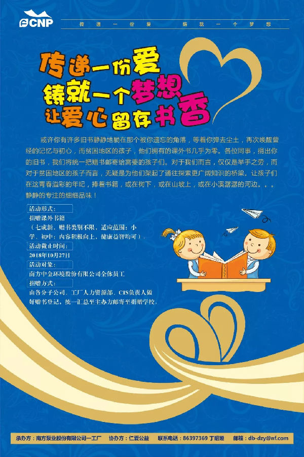 或許你有許多舊書靜靜地躺在那個被你遺忘的角落,等著你彈去塵土,再次喚醒曾經(jīng)的記憶與初心,而貧困地區(qū)的孩子,他們擁有的課外書幾乎為零。各位同事,捐出你的舊書,我們將統(tǒng)一把贈書郵寄給需要的孩子們。對于我們而言,僅僅是舉手之勞,而對于貧困地區(qū)的孩子而言,無疑是為他們架起了通往探索更廣闊知識的橋梁。讓孩子們在這青春溢彩的年紀,捧著書籍,或在樹下,或在山坡上,或在小溪潺潺的河邊......靜靜的細細品味!由南方泵業(yè)股份有限公司主辦,南方泵業(yè)股份有限公司一工廠承辦,仁愛公益協(xié)辦的“傳遞一份愛,鑄就一個夢想,讓愛心留存書香”捐書活動正式開啟,讓我們用我們的一點愛心,為孩子們送去知識的海洋!