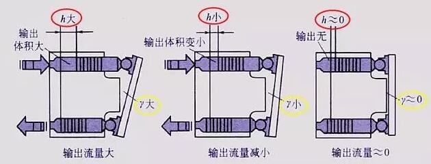 軸向柱塞泵的變量原理如下圖1所示,當(dāng)改變斜盤傾角γ的大小時(shí),可以改變每一根柱塞往復(fù)行程差值h的大小,從而改變了泵的輸出流量。