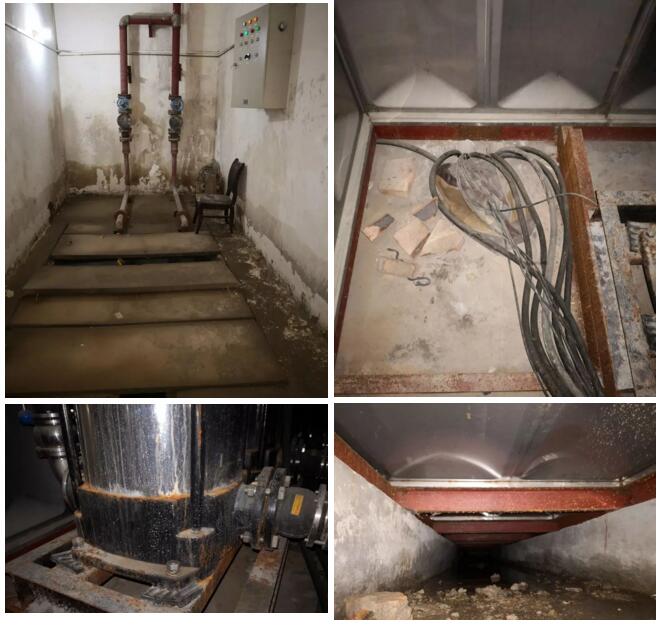 南方智水嚴(yán)肅面對(duì)小區(qū)居民用水安全問(wèn)題,隨即從總部派出技術(shù)支持人員付諸行動(dòng)進(jìn)行實(shí)地勘察。根據(jù)考研結(jié)果顯示,例如下圖情況,整個(gè)小區(qū)7棟樓全部采用加壓供水,所有水泵及控制系統(tǒng)從2012年沿用至今,設(shè)備陳舊,工藝落后,且泵房位于小區(qū)地下一層,環(huán)境現(xiàn)況存在諸多隱患問(wèn)題。